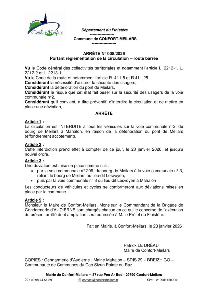 En raison d’un effondrement sur un accotement, le pont de Meilars, sur la route reliant Meilars à Mahalon, est barré à la circulation jusqu’à nouvel ordre pour des raisons de sécurité.